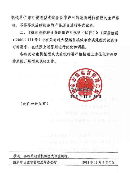 12月4日,国市监特设【2018】233号文《市场监管总局关于进一步优化超大型起重机械型式试验工作的意见》正式公开发布。